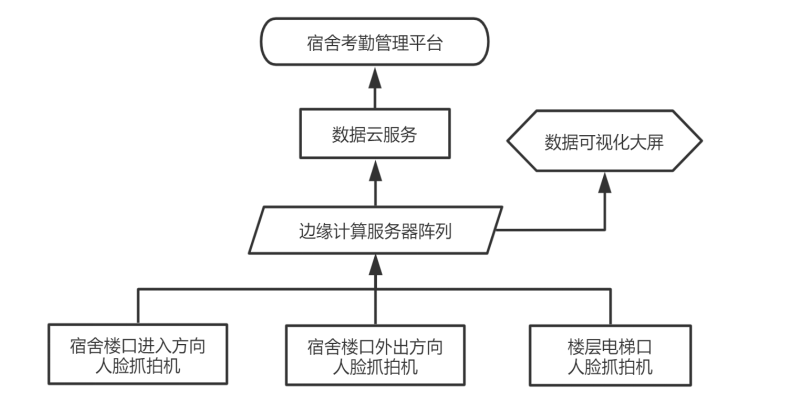 基于本校宿舍基本情況,結(jié)合學校運營管理模式,將宿舍考勤系統(tǒng)軟硬件模塊按照如下架構圖部署。綜合樓大門處出入兩方向根據(jù)樓道寬度分別安裝2-4個人臉識別抓拍機,6-11樓層電梯口各安裝2-3個人臉識別抓拍機,抓拍機視頻圖像數(shù)據(jù)通過網(wǎng)絡路由設備實時匯總*宿管邊緣計算服務器陣列,服務器將視頻流信息中解析出的人臉數(shù)據(jù)與校方學生人臉庫信息進行實時N比N快速驗證,獲得學生身份信息,將對比結(jié)果實時顯示在數(shù)據(jù)可視化大屏上。結(jié)合學校考勤及宿舍管理邏輯,將各維度報表分析推送*云服務器,校方管理人員可通過宿舍考勤管理平臺獲取數(shù)據(jù)分析結(jié)果。